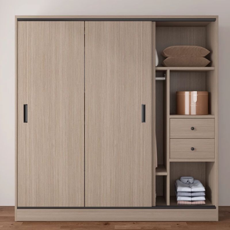 Fitur : 2 pintu sliding, rak terbuka, 2 laci serbaguna, gantungan baju